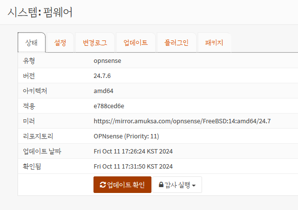 미러는 반드시 custom으로 변경하고 https://mirror.amuksa.com/opnsense 를 입력하고 저장을 누릅니다.