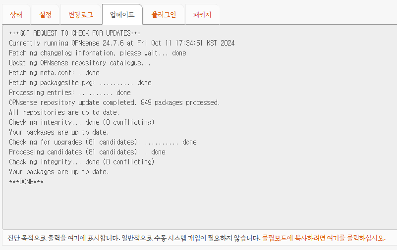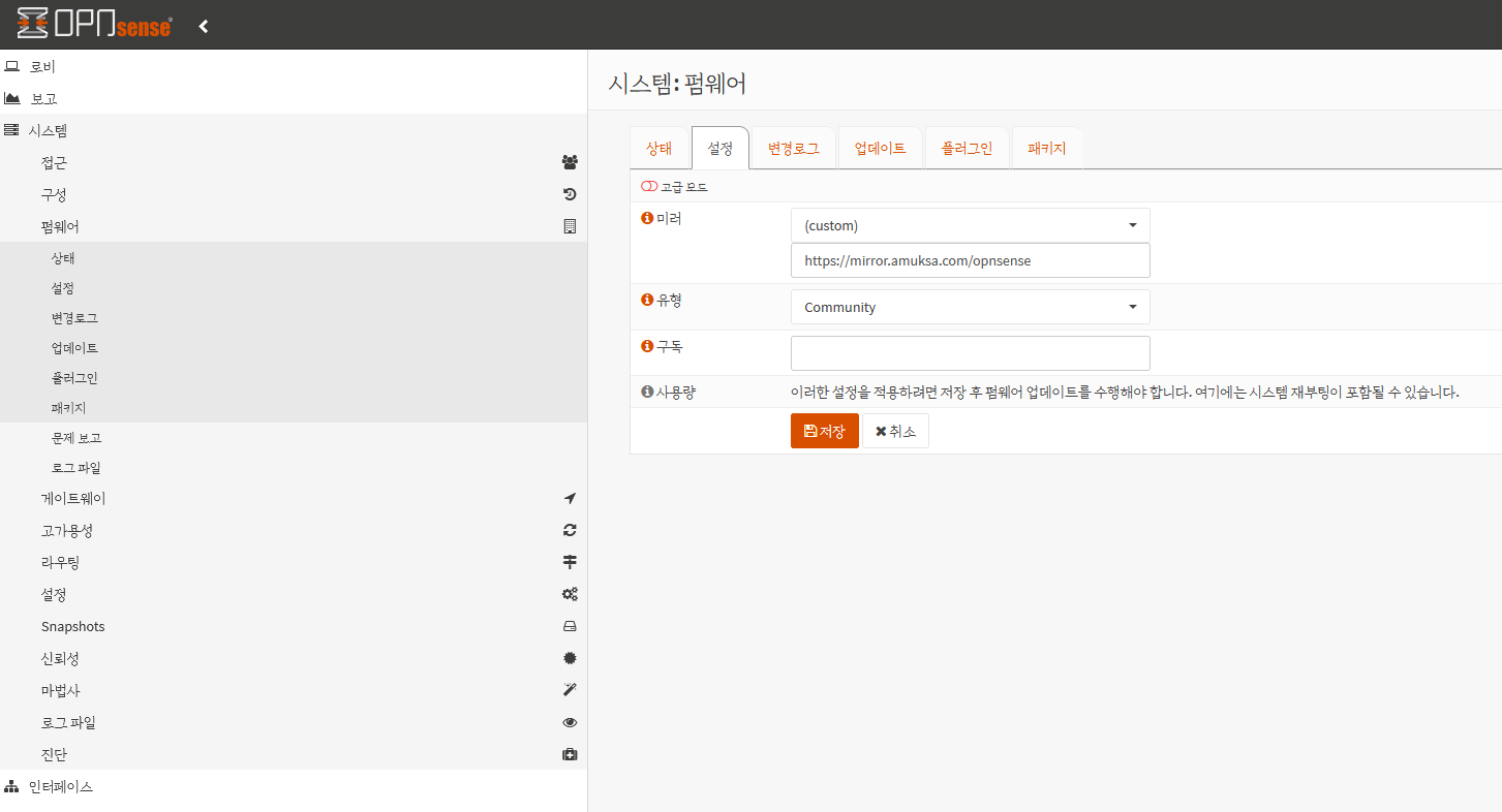 미러는 반드시 custom으로 변경하고 https://mirror.amuksa.com/opnsense 를 입력하고 저장을 누릅니다.
